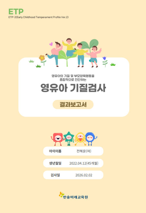 영유아 기질검사(Early Childhood Temperament Profile Ver.2, ETP-2)는 단순한 기질 분류를 넘어 영유아의 행동 양상과 부모의 양육 특성을 종합적으로 비교 분석한 검사입니다. 영유아의 대표적 기질유형 뿐 아니라, 핵심 기질 요인과 부모의 양육행동 특성을 연령군별 요인별로 다차원적으로 진단하여 아동과 가족의 관계성과 성장환경의 질을 심층적으로 파악할 수 있는 근거자료를 제공합니다. ETP-2의 결과는 영유아의 개별 기질에 따르는 다양한 유형을 도출하여 상담과 교육에서 맞춤형 지원을 하는데 유용합니다
