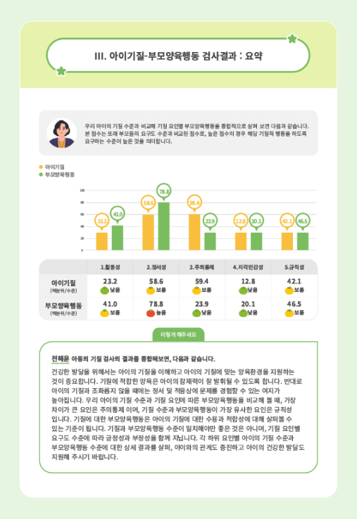 • 기질유형, 기질특성, 부모양육행동 3개 영역으로 총 52~54문항 (15~20분 소요)